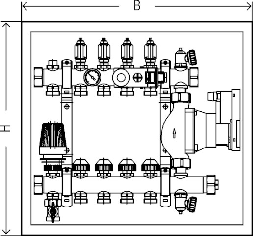 Stacja regulacyjna dla małych powierzchni stal nierdzewna, zmontowana i odrutowana, nr wzoru 1256 n: 4 B: 430 H: 480 T: 115 zakres regulacji: 20–70