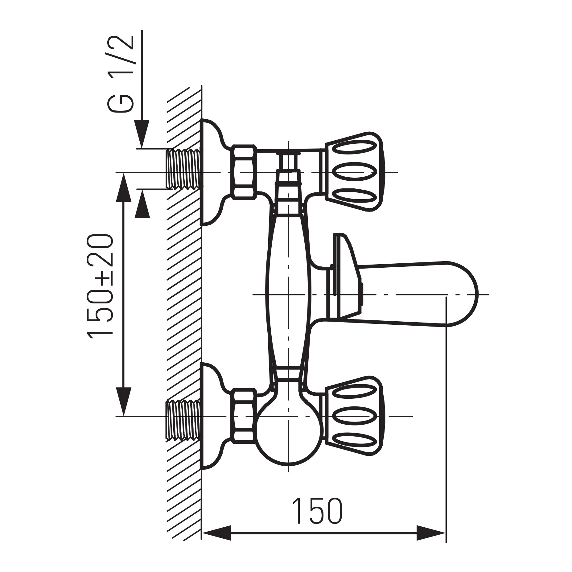 Bateria wannowa ścienna, dwuuwchytowa wyposażona w natrysk punktowy z klasyczną, ergonomiczną, 1-funkcyjną rączką natryskową, wbudowany uchwyt prysznicowy oraz trwały wąż prysznicowy.