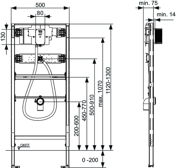 Stelaż podtynkowy do pisuaru TECE profil U2, 1120 x 500 x 75 mm, regulacja wysokości