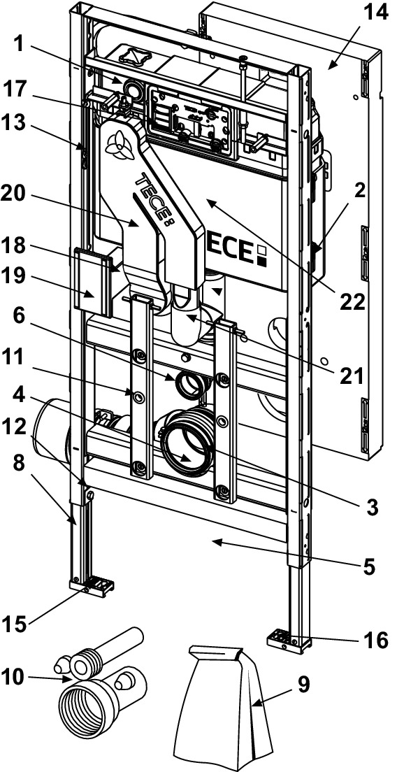 Podtynkowy moduł WC przeznaczony do montażu na kształtownikach stalowych TECEprofil lub do instalacji w ścianach z profili metalowych lub drewnianych oraz jako ścianka przednia lub stelaż narożnikowy.