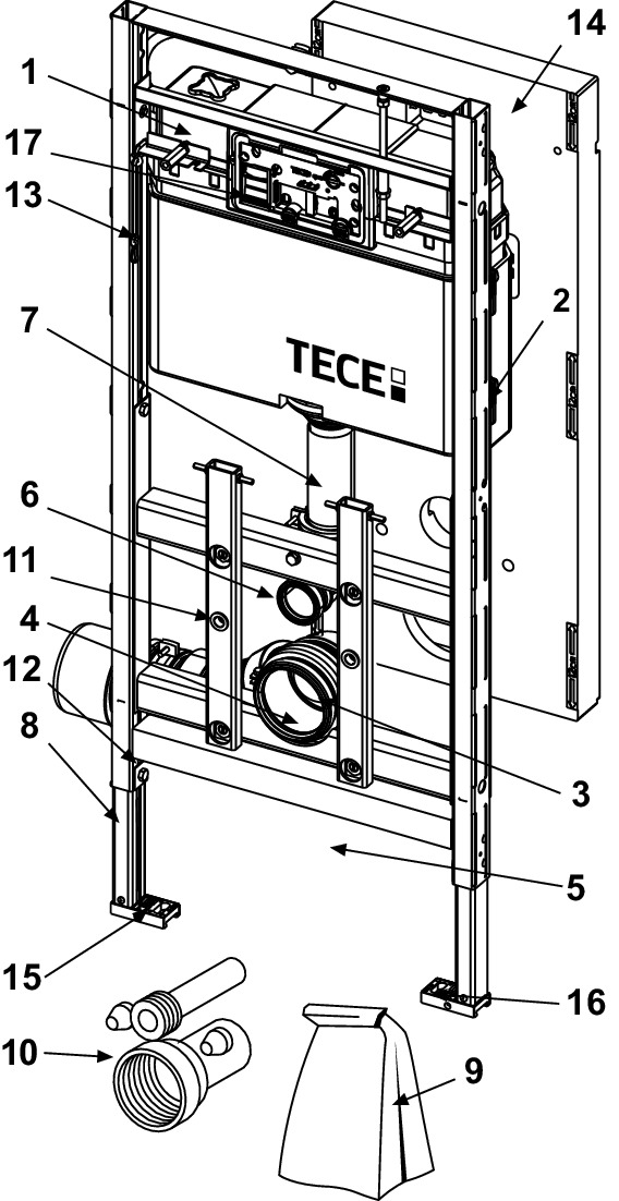Podtynkowy moduł WC przeznaczony do montażu na kształtownikach stalowych TECEprofil lub do instalacji w ścianach z profili metalowych lub drewnianych oraz jako ścianka przednia lub stelaż narożnikowy.