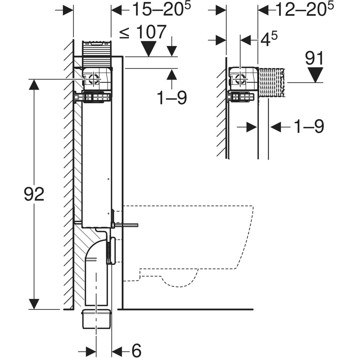 Zastosowanie: Do zabudowy ciężkiej Do montażu w ściankach instalacyjnych o częściowej wysokości pomieszczenia Do wiszących misek WC o wymiarach przyłączeniowych zgodnych z EN 33:2011 Do spłukiwania dwudzielnego Charakterystyka: Rama elementu montażowego powlekana proszkowo Rama montażowa z czterema kątownikami montażowymi Możliwość regulacji głębokości zabudowy elementu montażowego w zakresie od 12–20,5 cm Kolano przyłączeniowe z możliwością montażu bez użycia narzędzi Spłuczka podtynkowa z uruchamianiem od góry lub od przodu Spłuczka podtynkowa z izolacją przeciwroszeniową W przypadku ustawień fabrycznych ponowne spłukiwanie możliwe natychmiast Prace montażowe i serwisowe przy spłuczce podtynkowej bez użycia narzędzi Przyłącze wody z boku z lewej strony lub z tyłu z lewej strony Obudowa ochronna otworu rewizyjnego chroni przed wilgocią i zabrudzeniami Obudowa ochronna otworu rewizyjnego z możliwością skrócenia Wyposażono w rurkę ochronną umożliwiającą szybkie podłączenie wody do toalet myjących Geberit AquaClean Z możliwością zamocowania przyłącza elektrycznego Zakres dostawy: Przyłącze wody R 1/2", typu MF, ze zintegrowanym zaworem kątowym i pokrętłem Obudowa ochronna otworu rewizyjnego Zestaw przyłączeniowy do WC, ø 90 mm Kolano przyłączeniowe z PE-HD, ø 90 mm Kielich przejściowy z PE-HD, ø 90 / 110 mm 2 zaślepki ochronne Zestaw do izolacji akustycznej 2 pręty gwintowane M12 Elementy mocujące
