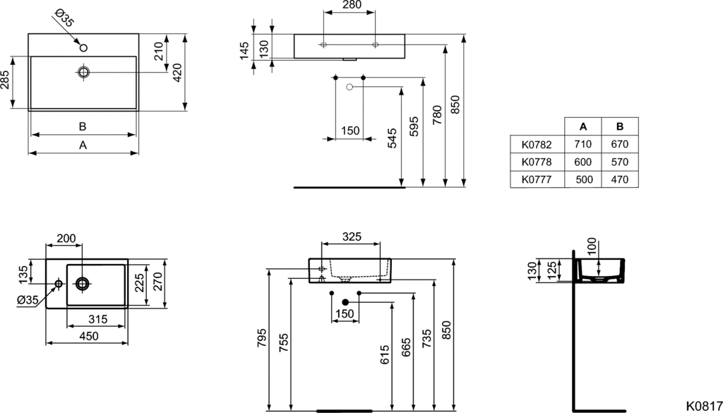 Z otworem lub bez otworu na baterię. Możliwość skompletowania z odpowiednimi meblami lub syfonem chromowanym K0103AA. W komplecie szablon do wycinania w blacie. Brak zestawu montażowego, rekomendowany zestaw typu M10 x 140 mm. Zalecane dodatkowe elementy: Zestaw montażowy M10 x 140 mm WW965340. Syfon dekoracyjny do umywalki G1 1/4 E0079AA. Przyłącze kątowe dekoracyjne A3491AA. Syfon G1 1/4 A2305AA. Przyłącze kątowe B7883AA. Rozeta do syfonu G1 1/4 B4801AA. Korek G1 1/4 do umywalek bez przelewu J3291AA.