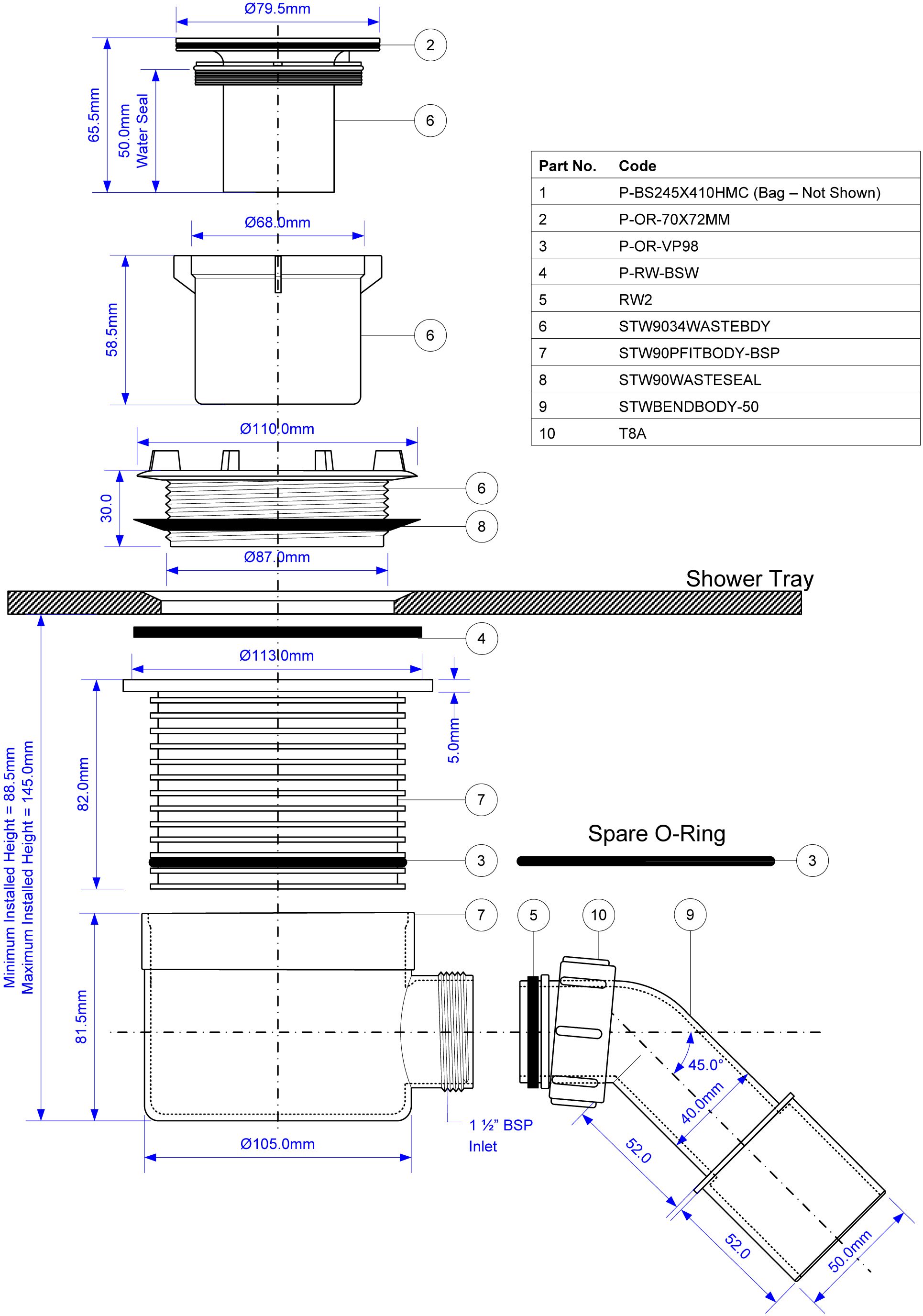 Syfon do odpływów kwadratowych z regulowaną wysokością w zakresie od 88,5 do 145mm.