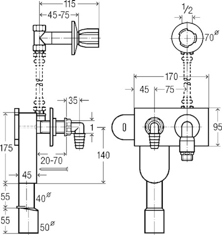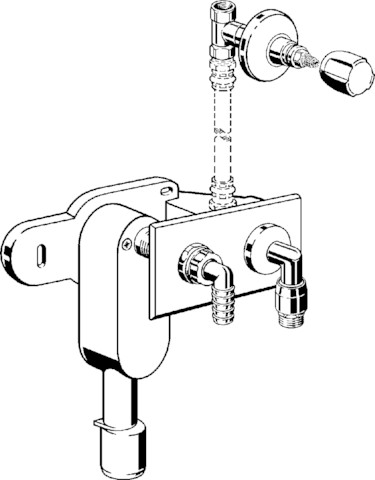 Syfon. Przeznaczenie: wbudowanie w ścianę, wąż odprowadzający wodę z pralki lub zmywarki do naczyń, tworzywo sztuczne, z zintegrowanym zaopatrzeniem w wodę. Wyposażenie: Zawór podtynkowy ½, łuk odpływowy z zaworem zwrotnym i z napowietrzaczem rury, szyna montażowa, płytka maskująca ze stali nierdzewnej, dwuzłączka do węża 90° chromowana, wg DIN 19541, nr wzoru 5635.2, nr kat. 369 217, DN: 40/50