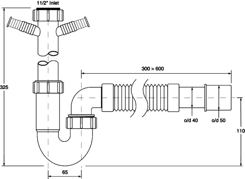 Syfon zlewozmywakowy rurowy 11/2"x50mm z podłączeniem do pralki lub zmywarki i odejściem uniwersalnym-harmonijkowym, bez spustu.