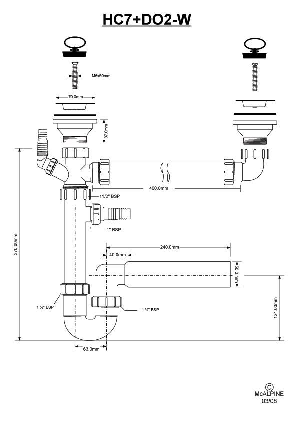Syfon zlewozmywakowy podwójny rurowy 11/2"x50mm z podłączeniem do pralki i zmywarki, ze spustami 70mm.