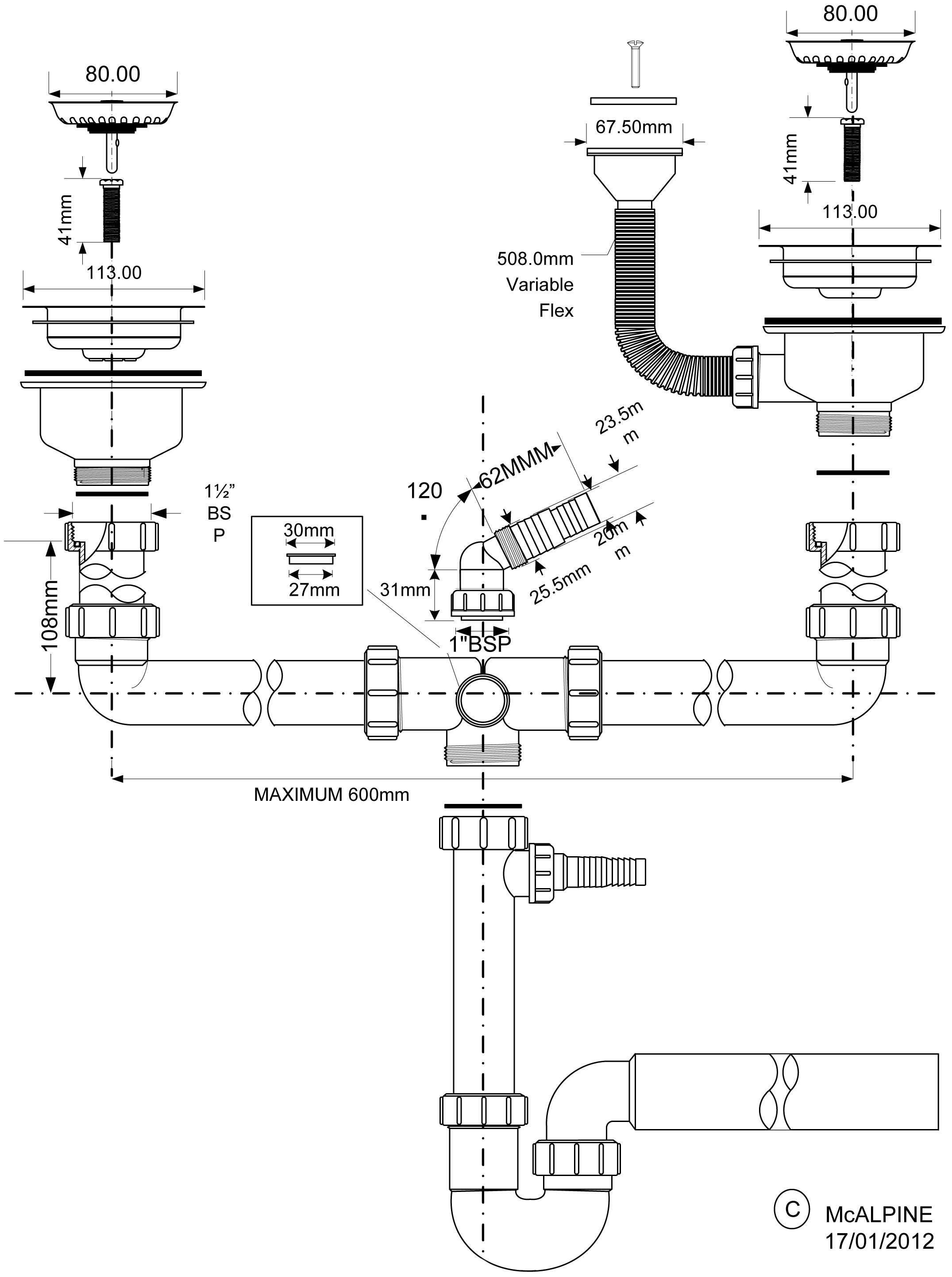 Syfon zlewozmywakowy rurowy podwójny 11/2"x50mm z podłączeniem do pralki i zmywarki, ze spustami 113mm i przelewem z ujsciem prostokątnym.