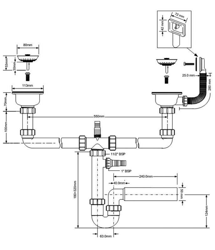 Syfon zlewozmywakowy rurowy podwójny 3,5"X50mm z podłączeniem pralki lub zmywarki, przelew