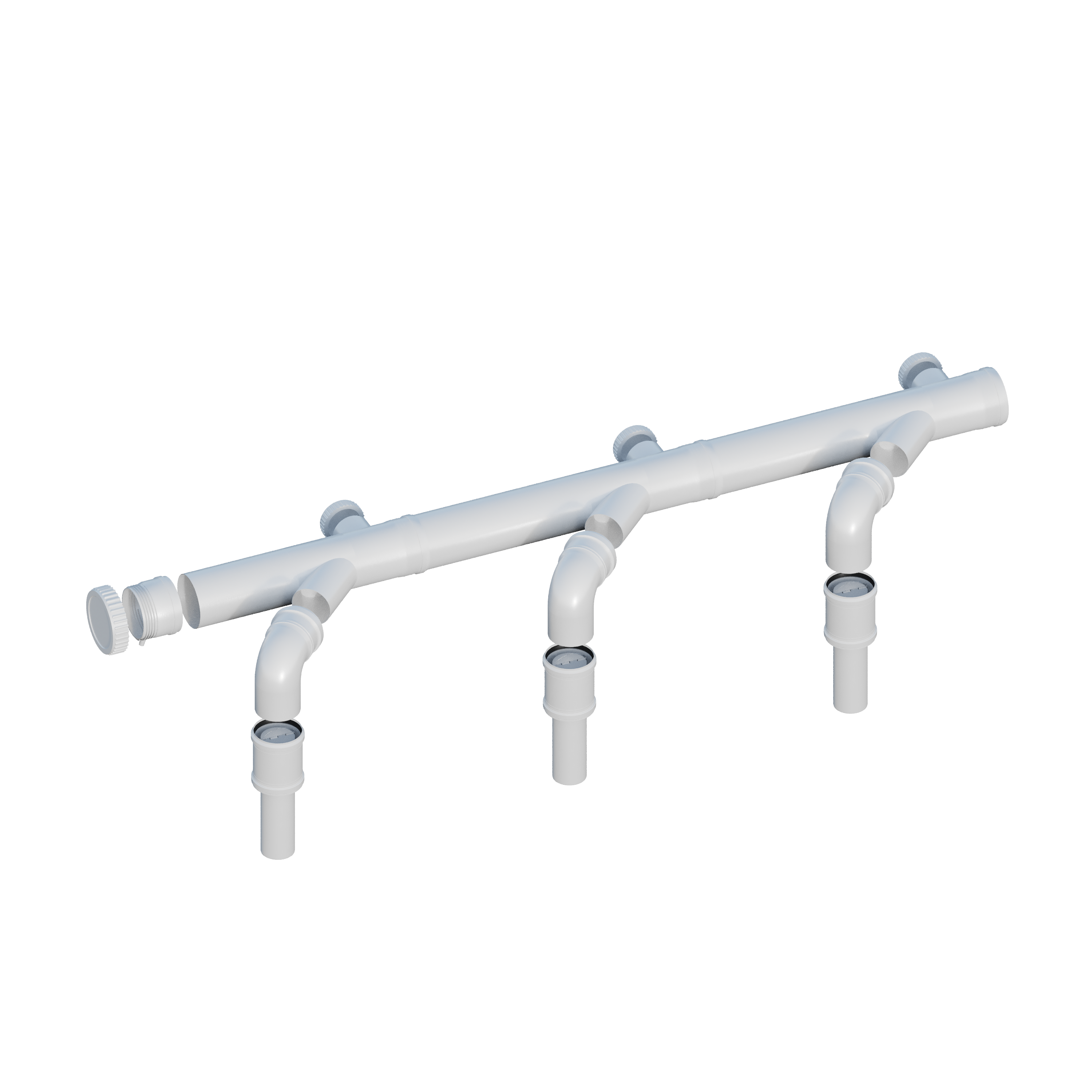 bardzo łatwy montaż, możliwość podłączenia trzech kotłów jednocześnie, gwarancja 15 lat, estetyczne wykonanie Pakiet zawiera elementy do podłączenia trzech kotlów DN 125/80: kolektor, 3 adaptery z klapką, 3 kolana 87°, pokrywa rewizyjna z odprowadzaniem kondensatu,