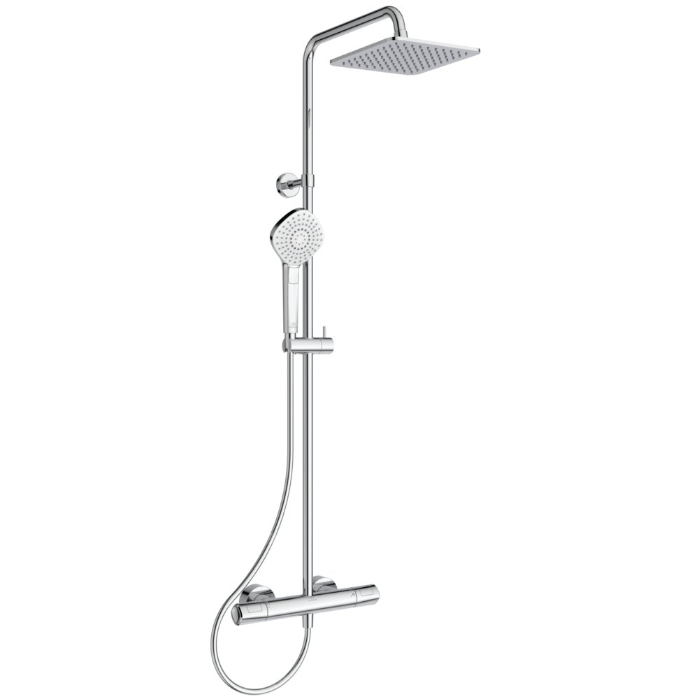 Bateria natryskowa naścienna z akcesoriami. Ukryte przyłącza mimośrodowe. Głowica termostatyczna IS nowej technologii. Ceramiczny zawór G1/2 180°. Diamentowy uchwyt z ogranicznikiem temperatury do 40°C i przyciskiem redukującym przepływ wody o 50%. Zawór zwrotny. W komplecie system natryskowy: deszczownica metalowa Ø200 mm, z ogranicznikiem przepływu 12 l/min, słuchawka natryskowa 110 mm 3-funkcyjna Idealrain Evo Round, z ogranicznikiem przepływu 8l/min, pozioma regulacja punktów mocowania do ściany oraz wąż natryskowy 1750 mm Idealflex. Zalecane dodatkowe elementy: przedłużenie do drążka natryskowego, 150 mm A861379AA lub przedłużenie do drążka natryskowego, 300 mm A861380AA.