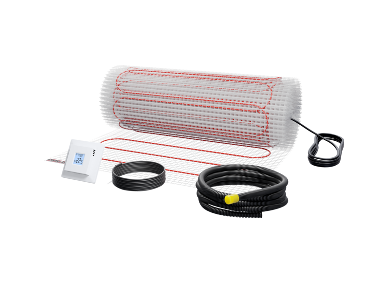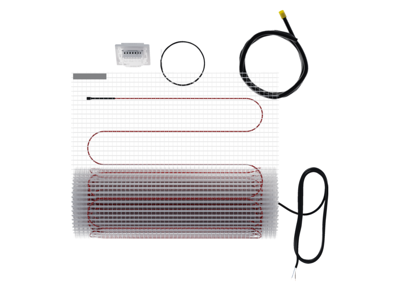 • Ze względu na niewielką grubość montażową matę grzewczą można ułożyć bezpośrednio w kleju do płytek pod okładziną ceramiczną.Pod dywanami i innymi wykładzinami podłogowymi umieszczana jest w warstwie wyrównawczej.W połączeniu z wodnym ogrzewaniem podłogowym można w ten sposób również poza sezonem grzewczym zapewnić sobie komfort ciepłej podłogi.Przewody grzewcze przyszyte są w całości do samonośnej maty, dzięki czemu można je łatwo i szybko ułożyć na podłodze. Montaż