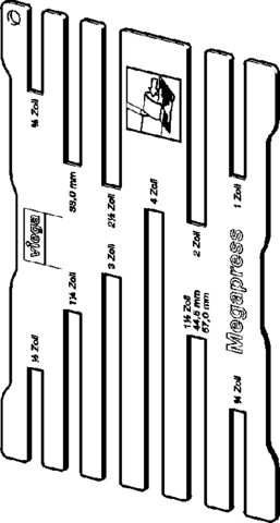 Megapress-szablon. Przeznaczenie: zaznaczanie głębokości wsunięcia rur stalowych wg PN-EN 10220/10255, nr wzoru 4294, nr kat. 799 298, dla D: ⅜–4 do Ø zewn.: 38/44,5/57