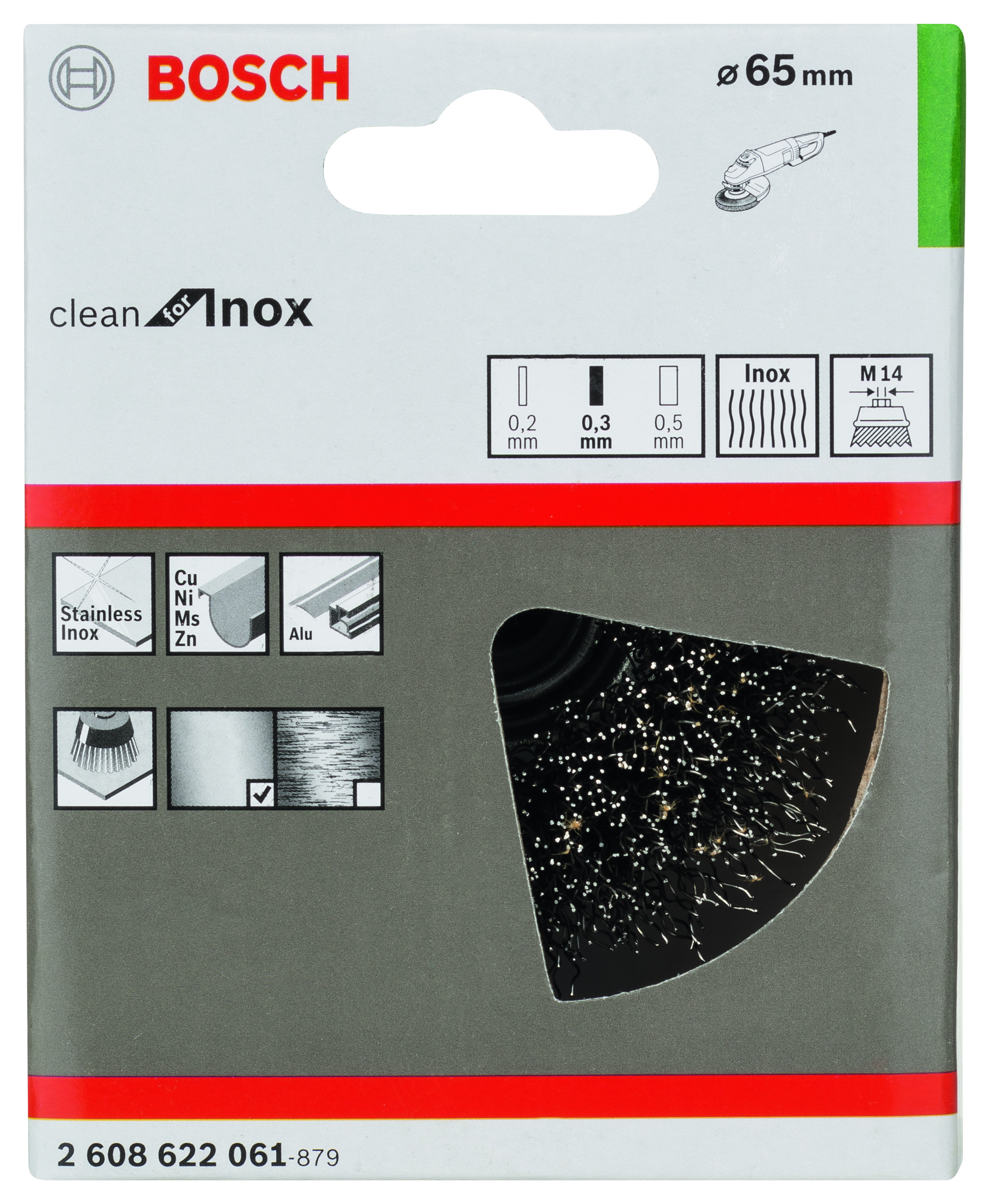 Tekst produktu, osprzęt szary Szczotka garnkowa – drut falisty, nierdzewny Do lekkich i średniociężkich prac związanych z czyszczeniem średnich i dużych powierzchni z metali szlachetnych, aluminium i metali kolorowych, jak np. usuwanie powłok, usuwanie korozji, bruzdkowanie, matowanie, usuwanie lakieru, strukturowanie. Do wszystkich szlifierek kątowych z gwintem M 14 oraz szlifierki prostej GGS 6 S Professional