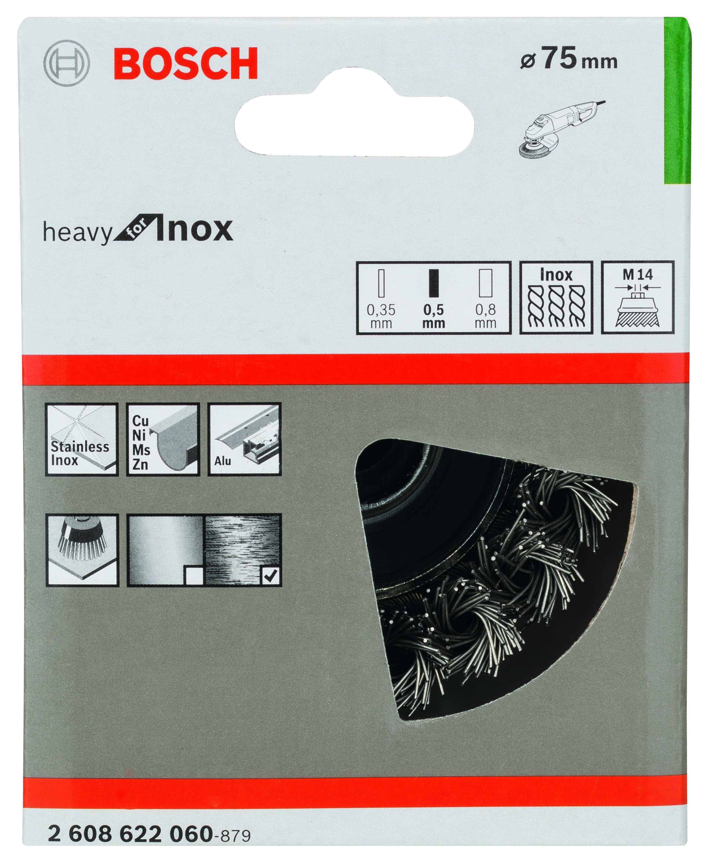 Tekst produktu, osprzęt szary Szczotka garnkowa – drut pleciony, nierdzewny Do ciężkich prac związanych z czyszczeniem średnich i dużych powierzchni z metali szlachetnych, aluminium i metali kolorowych, jak np. usuwanie silnej korozji, usuwanie farby lub lakieru. Do wszystkich szlifierek kątowych z gwintem M 14 oraz szlifierki prostej GGS 6 S Professional