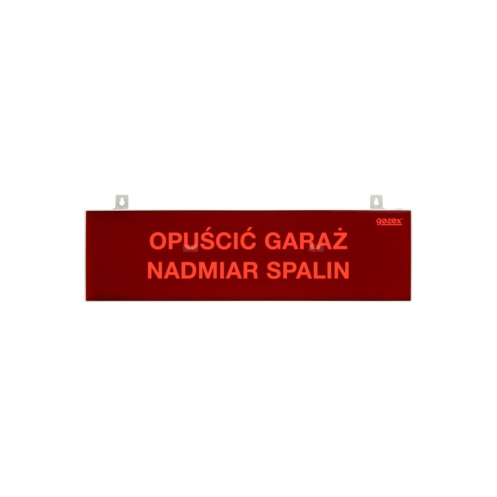 tablica ostrzegawcza dwustronna "OPUŚCIĆ GARAŻ NADMIAR SPALIN", podświetlenie czerwone LED, wbudowana cicha syrenka, zasilanie 12/24V