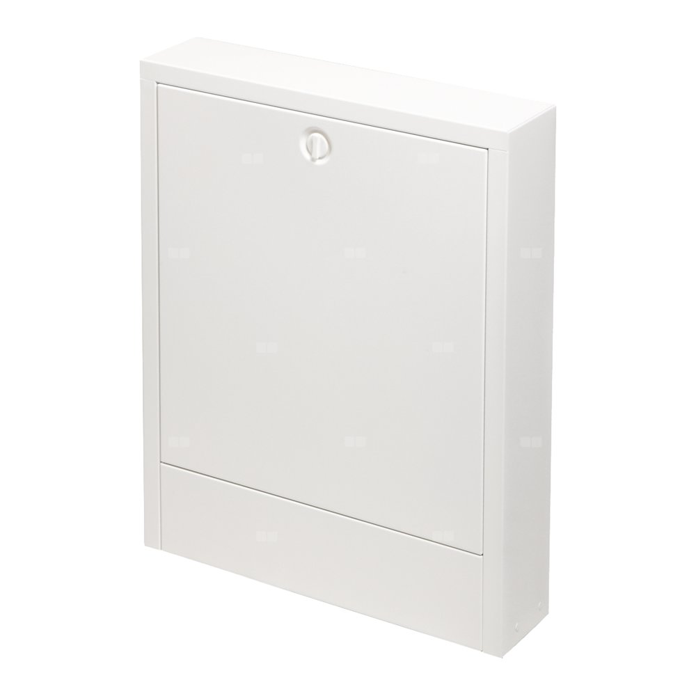 Szafka rozdzielaczowa natynkowa Comfort, wykonana z ocynkowanej blachy stalowej o grubości 1 mm, malowana proszkowo na kolor biały (RAL 9016), z dodatkowa przestrzenią oraz zamontowaną szyną DIN do montażu modułu głównego automatyki sterującej TECEfloor, zdejmowany panel tylny wyposażony w dwie demontowalne szyny mocujące z antypoślizgowymi śrubami do montażu rozdzielacza podłogowego, głębokość: 140 mm, wysokość: 710 mm.