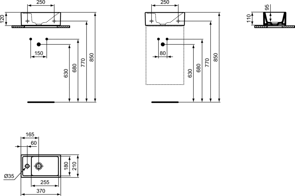 Umywalka do mycia rąk 37 cm. Otwór na baterię po lewej stronie. Otwór na baterię po prawej lub lewej stronie. EN 14688. Mocowana do ściany. Do skompletowania z syfonem. Zalecane dodatkowe elementy: - Zestaw montażowy M8 x 90 mm K714467. Syfon G1 1/4 - typowy A2305AA. Przyłącze kątowe (dopływ G1/2, bateria 10mm/G3/8) B7883AA. Rozeta do syfonu G1 1/4 (w przypadku montażu baterii bez korka) B4801AA.
