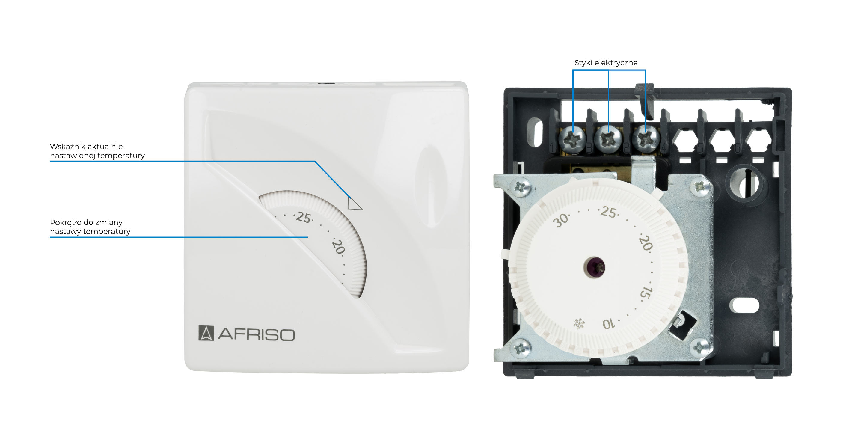 Włącza lub wyłącza sterowane urządzenie w zależności od temperatury zmierzonej w pomieszczeniu i nastawionej na pokrętle.