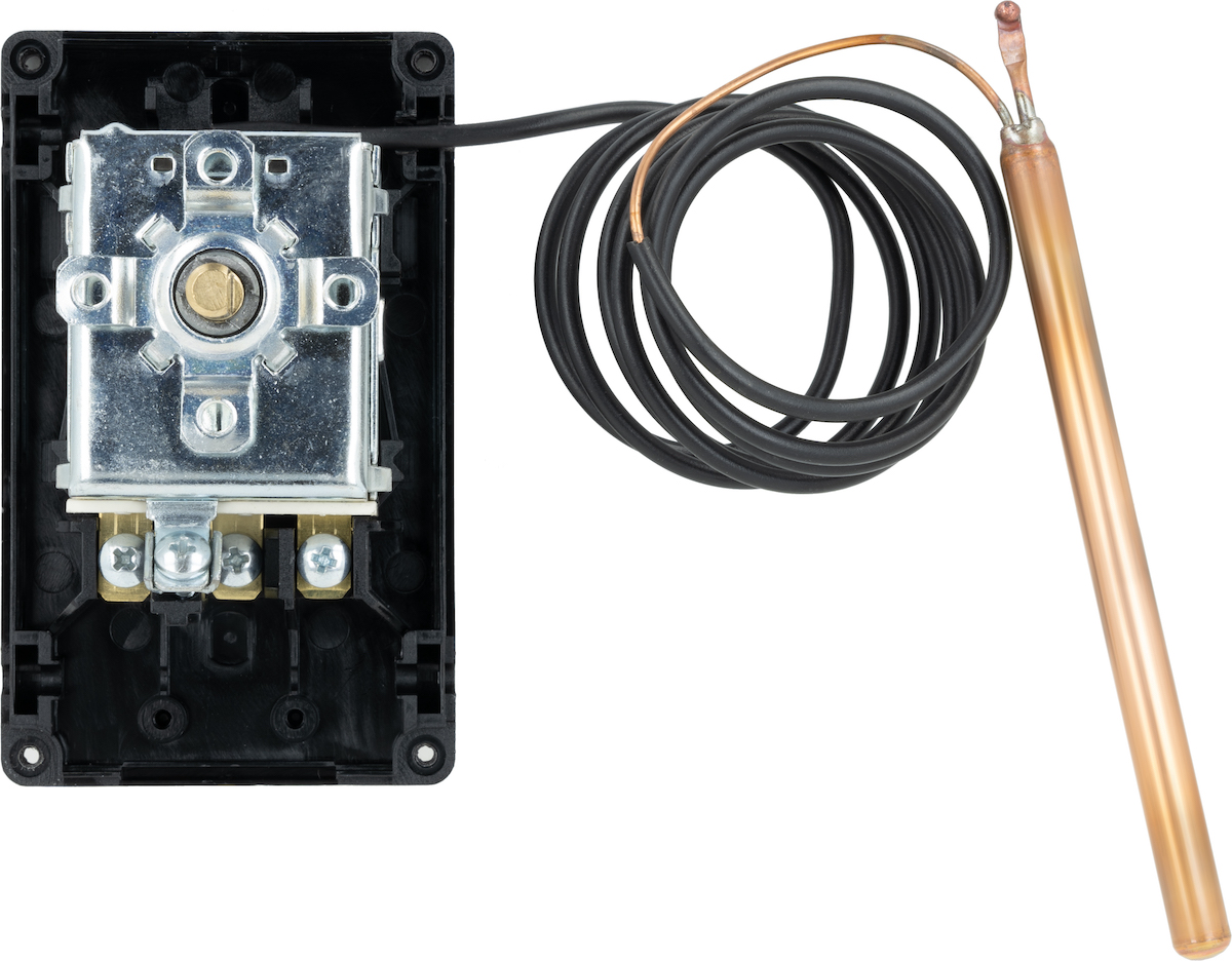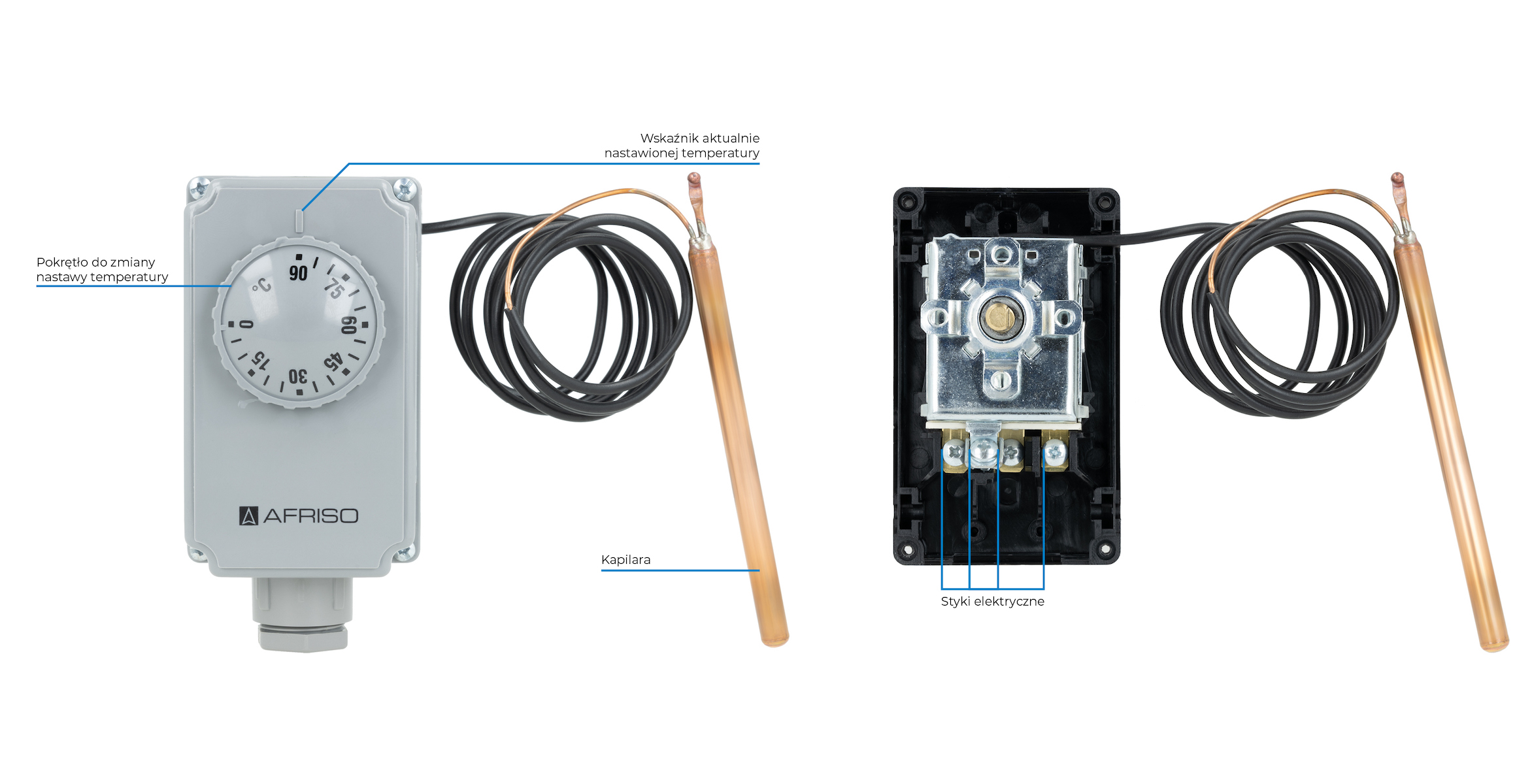 Wyposażony w kapilarę o długości 1000mm, co umożliwia montaż termostatu z dala od miejsca pomiaru.