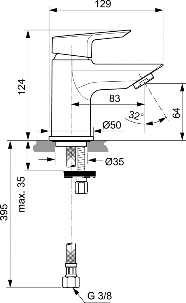 Głowica ceramiczna IS 28 mm. Ogranicznik temperatury wody, metalowy uchwyt z oznaczeniem wody ciepłej i zimnej. Perlator typu Cascade z ogranicznikiem przepływu wody do 5 l/min. Metalowy korek automatyczny. Wężyki przyłączeniowe G3/8". System montażu EASY-FIX. Metalowy pierścień. Zgodność z EN817.