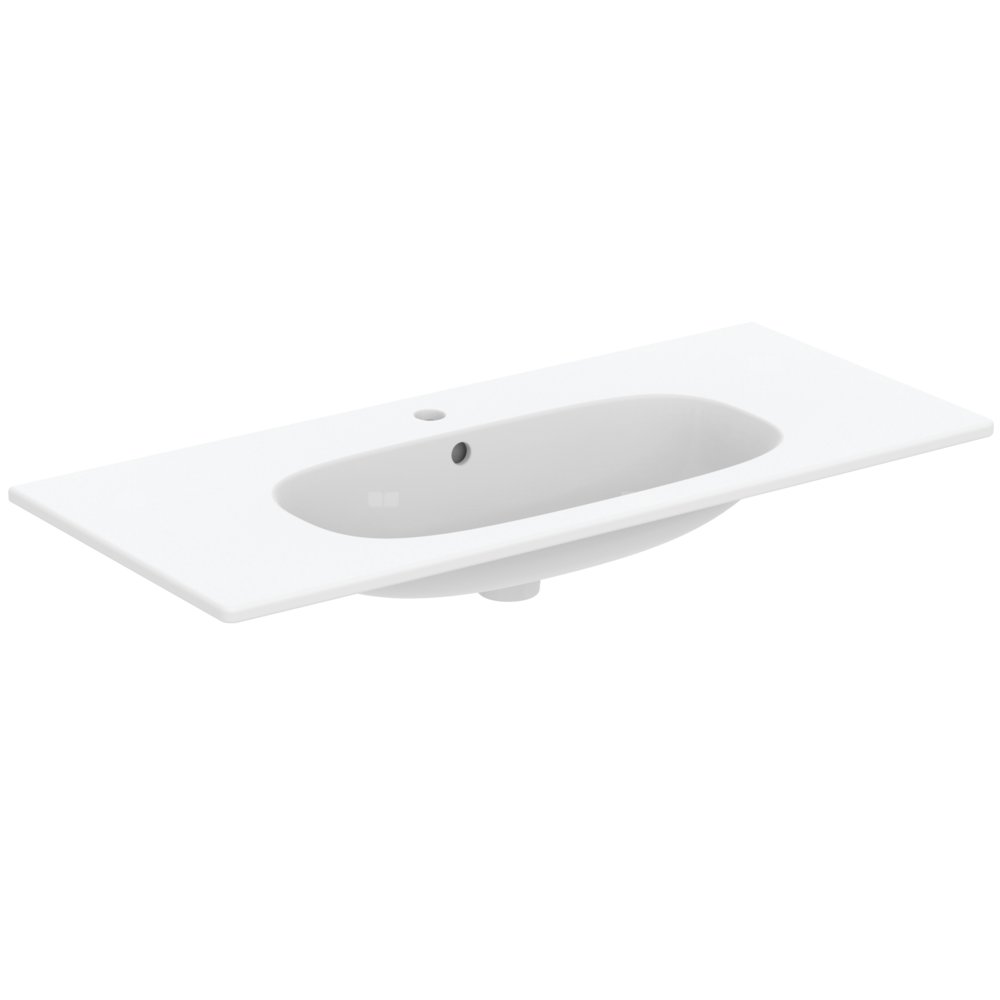 Umywalka Strada z powierzchniami bocznymi oraz centralnym otworem na baterię i przelewem. Do montażu z szafką pod umywalkę Tesi 100 cm lub samodzielnie z syfonem.