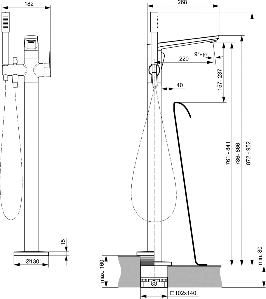 Bateria wannowo-natryskowa wolnostojąca Tonic II. Głowica Multiport 40 mm z ogranicznikiem temperatury. Mosiężny korpus wykonany z dwóch części z automatycznym przełącznikiem. Perlator typu Cascade z regulacją kierunku strumienia. Metalowy uchwyt z nadrukowanymi czerwonymi i niebieskimi oznaczeniami. Słuchawka natryskowa Stick, gładki wąż natryskowy IdealFlex 1250 mm. Zestaw montażowy z regulowaną głębokością montażu w posadzce w zakresie 80-160 mm. Rozeta podłogowa chromowana. Do skompletowania z elementem montażowym: A6133NU.