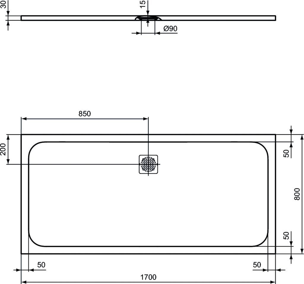 Brodzik grubości 30mm wykonany z materiału IDEAL SOLID. Klasa anty-poślizgowa C. Montaż na podłodze lub nad podłogą (do skompletowania z nogami do brodzika). Pokrywa odpływu ze stali nierdzewnej. Zalecane dodatkowe elementy: Syfon do brodzika - bez pokrywy (K936367). Uniwersalny zestaw nóg do brodzika (dla rozmiaru 1000 mm i większych - konieczne są 2 szt. K936467) (K936467).