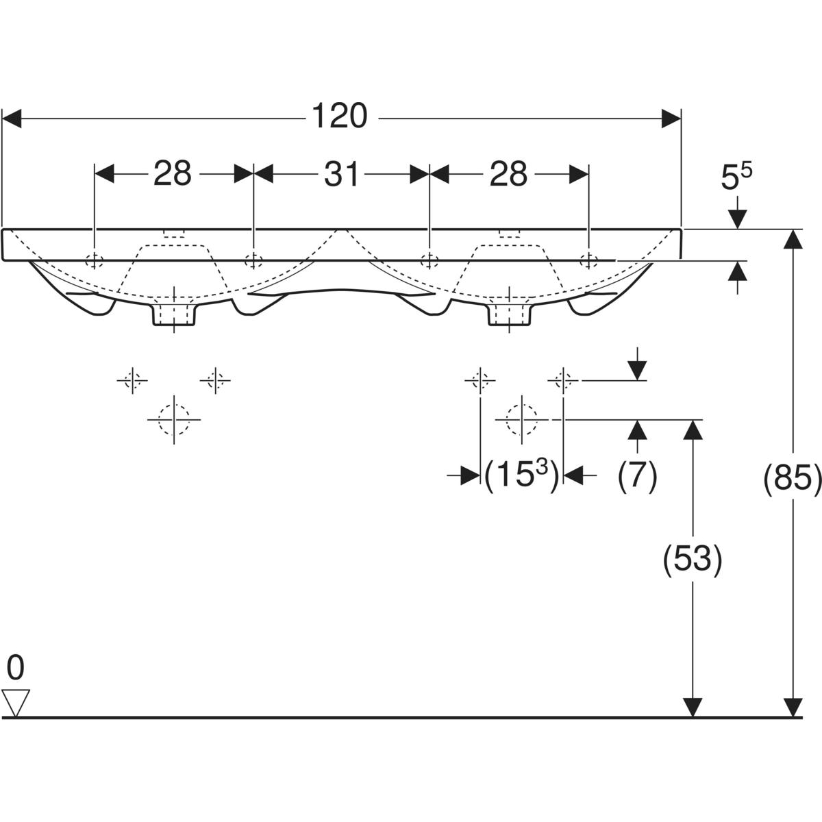 Umywalka GEBERIT Acanto podwójna 2-stanowiskowa prostokątna, biała / KeraTect, 1200mm, otwór na baterię na środku, z odpływem przelewowym, półka od ściany