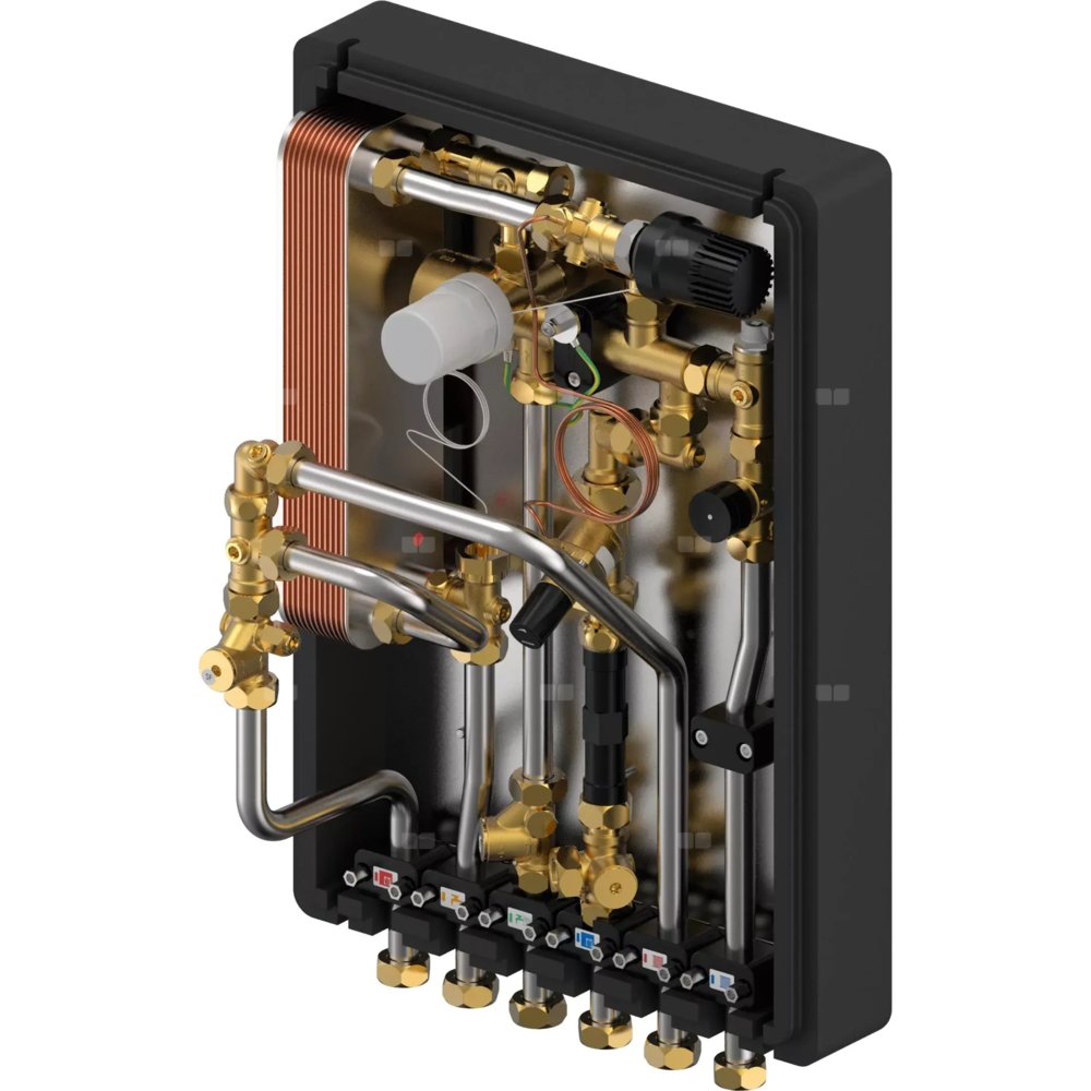 - Stacja mieszkaniowa (HIU) całkowicie zmontowana i poddana próbie ciśnieniowej- Stacja zabudowana w obudowie izolacyjnej, aby uniknąć strat ciepła- Ograniczenia techniczne dotyczące stosowania w instalacjach wody grzewczej i wodno-kanalizacyjnych przedstawiono w kartach danych technicznych- Zawór PM z opatentowaną technologią potrójnego uszczelnienia i certyfikatem DVGW- Izolacja termiczna rur doprowadzających ciepłą wodę- Termosyfon podnosi poziom higieny, zapobiegając nagrzewaniu się wymiennika w stanie czuwania- Zawór strefowy we wtórnym obiegu grzewczym- Punkt czerpalny wody zimnej z adapterem 110 mm × 3/4″ do opomiarowania- Filtr siatkowy 0,5 mm w głównej rurze zasilającej i głównej rurze powrotnej- Możliwość podłączenia (w oznaczonym miejscu) końcówki oczkowej uziemienia obwodu elektrycznego- Maks. ciśnienie robocze, obieg ogrzewania: PN 10- Maks. ciśnienie robocze, obieg wody: PN 10- Maks. temperatura robocza: 5–85°C- Maks. różnica ciśnień, główny obieg ogrzewania: 2,5 bara- Min. ciśnienie, obieg wody: 2,0 bara- Materiał złączki, obieg wody: CW617N- Materiał złączki, obieg ogrzewania: CW617N, CW614N- Materiał rury: stal nierdzewna 1.4401- Elementy na uchwycie do montażu naściennego- Wymiary: szer. × wys. × gł. — 390 × 578 × 280 mm