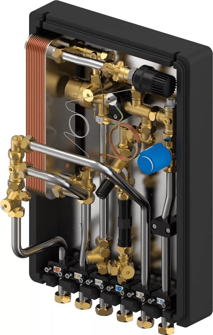 - Stacja mieszkaniowa (HIU) całkowicie zmontowana i poddana próbie ciśnieniowej- Stacja zabudowana w obudowie izolacyjnej, aby uniknąć strat ciepła- Ograniczenia techniczne dotyczące stosowania w instalacjach wody grzewczej i wodno-kanalizacyjnych przedstawiono w kartach danych technicznych- Zawór PM z opatentowaną technologią potrójnego uszczelnienia i certyfikatem DVGW- Izolacja termiczna rur doprowadzających ciepłą wodę- Termosyfon podnosi poziom higieny, zapobiegając nagrzewaniu się wymiennika w stanie czuwania- Zawór strefowy we wtórnym obiegu grzewczym- Punkt czerpalny wody zimnej z adapterem 110 mm × 3/4″ do opomiarowania- Filtr siatkowy 0,5 mm w głównej rurze zasilającej i głównej rurze powrotnej- Możliwość podłączenia (w oznaczonym miejscu) końcówki oczkowej uziemienia obwodu elektrycznego- Maks. ciśnienie robocze, obieg ogrzewania: PN 10- Maks. ciśnienie robocze, obieg wody: PN 10- Maks. temperatura robocza: 5–85°C- Maks. różnica ciśnień, główny obieg ogrzewania: 2,5 bara- Min. ciśnienie, obieg wody: 2,0 bara- Materiał złączki, obieg wody: CW617N- Materiał złączki, obieg ogrzewania: CW617N, CW614N- Materiał rury: stal nierdzewna 1.4401- Elementy na uchwycie do montażu naściennego- Wymiary: szer. × wys. × gł. — 390 × 578 × 280 mm