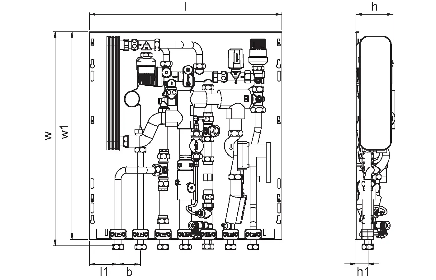 - Przyłącze całkowicie zmontowane i poddane próbie ciśnieniowej- Ograniczenia techniczne dotyczące stosowania w instalacjach wody grzewczej i wodno-kanalizacyjnych przedstawiono w kartach danych technicznych- Obejmy rurowe z tworzywa sztucznego zapewniają wyciszenie i izolację termiczną- Zawór PM z opatentowaną technologią potrójnego uszczelnienia i certyfikatem DVGW- Izolacja termiczna rur doprowadzających- Termostatyczny zawór obejściowy- Punkt czerpalny wody zimnej- Element dystansowy do ciepłomierza 110 mm × 3/4″- Element dystansowy do wodomierza 110 mm × 3/4″- Zawór odpowietrzający i spustowy- Filtr siatkowy 0,5 mm do wody zimnej- Filtr siatkowy 0,5 mm do głównej rury doprowadzającej ogrzewanie- Możliwość podłączenia (w oznaczonym miejscu) końcówki oczkowej uziemienia obwodu elektrycznego- Maks. ciśnienie robocze, obieg ogrzewania: PN 10- Maks. ciśnienie robocze, obieg wody: PN 10- Maks. temperatura robocza: 85°C- Maks. różnica ciśnień pierwotnego obiegu ogrzewania: 2,5 bara- Min. ciśnienie, obieg wody: 2,0 bara- Materiał złączki, obieg wody: CW617N- Materiał złączki, obieg ogrzewania: CW617N, CW614N- Materiał rury: stal nierdzewna 1.4401- Wymiary: szer. × wys. × gł. — 556 × 620 × 110 mm