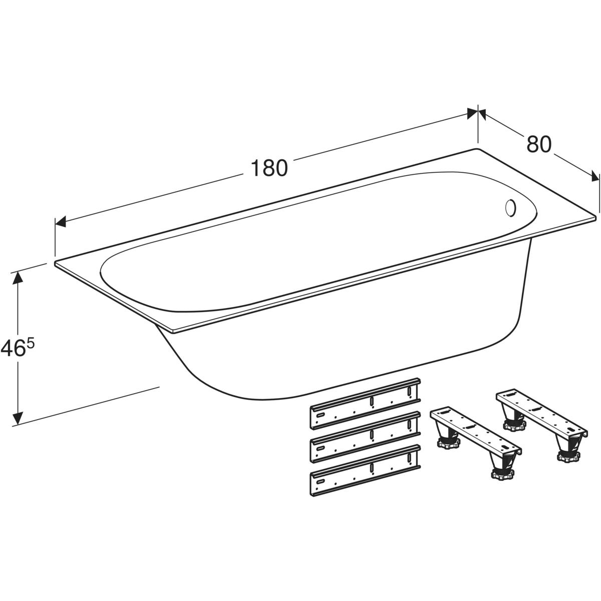 Wanna prostokątna Geberit Soana, slim rim, z nogami: 180x80cm, Całkowita pojemność=272l