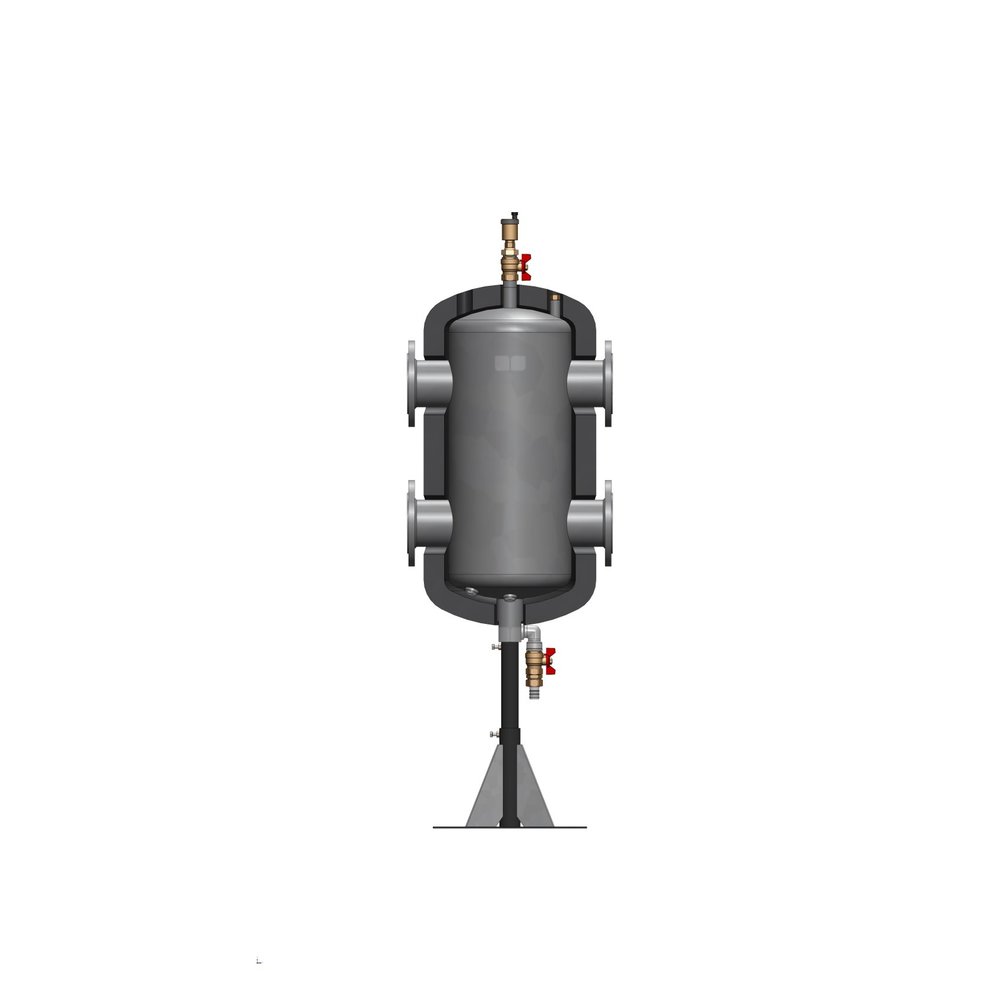 Pełni 3 funkcje: zwrotnicy hydraulicznej, separatora powietrza i gazu, jak również odmulnika (dopuszczenie UDT). Spawany, stalowy układ pionowego rozdzielacza hydraulicznego z przyspawanymi kołnierzami PN 6. Max. ciśnienie pracy 6 bar – zbiornik. Komora szlamowa zamontowana na dnie z czterema zakorkowanymi gniazdami ¾" GW do zamontowania wkładów magnetycznych. Automatyczny odpowietrznik z zaworem stopowym, tuleja zanurzeniowa o średnicy 10 mm do czujki temperatury ⅜" GW w górnej dennicy, armatura do płukania 1" zamontowana w górnej i dolnej dennicy. Regulowana wysokość podstawy (teleskop). Izolacja odpowiadająca przepisom o instalacjach grzewczych max. 130 °C.