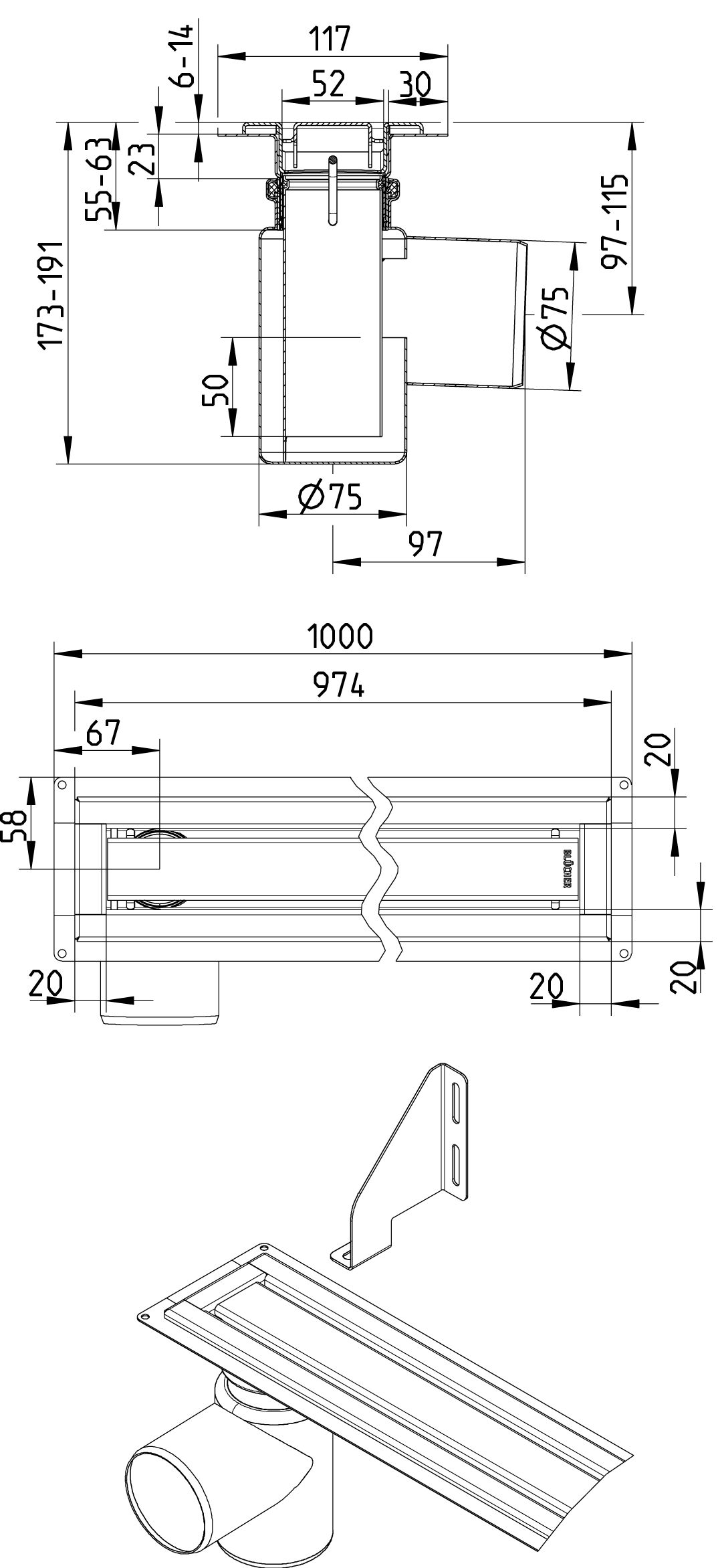 WaterLine Kanał prysznicowy 1000, zestaw z syfonem i rusztem