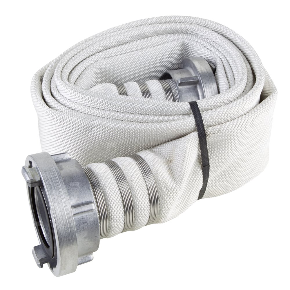 Wąż ciśnieniowy w wersji z włókien z tworzywa sztucznego (wąż gaśniczy; na zewnątrz włókna syntetyczne, wewnątrz powłoka gumowa) z zamontowanym złączem typu Storz do podłączania do przyłącza ciśnieniowego za pomocą odpowiedniego sztywnego szybkozłącza Storz.