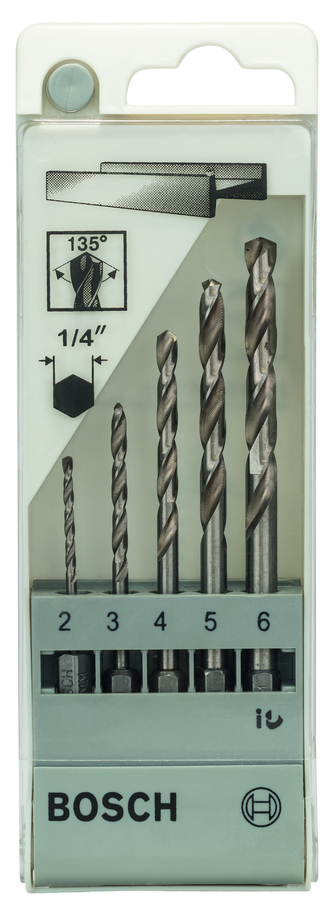 5-częściowy zestaw wierteł do metalu HSS-G, kąt wierzchołkowy 135°, chwyt sześciokątny 1/4"