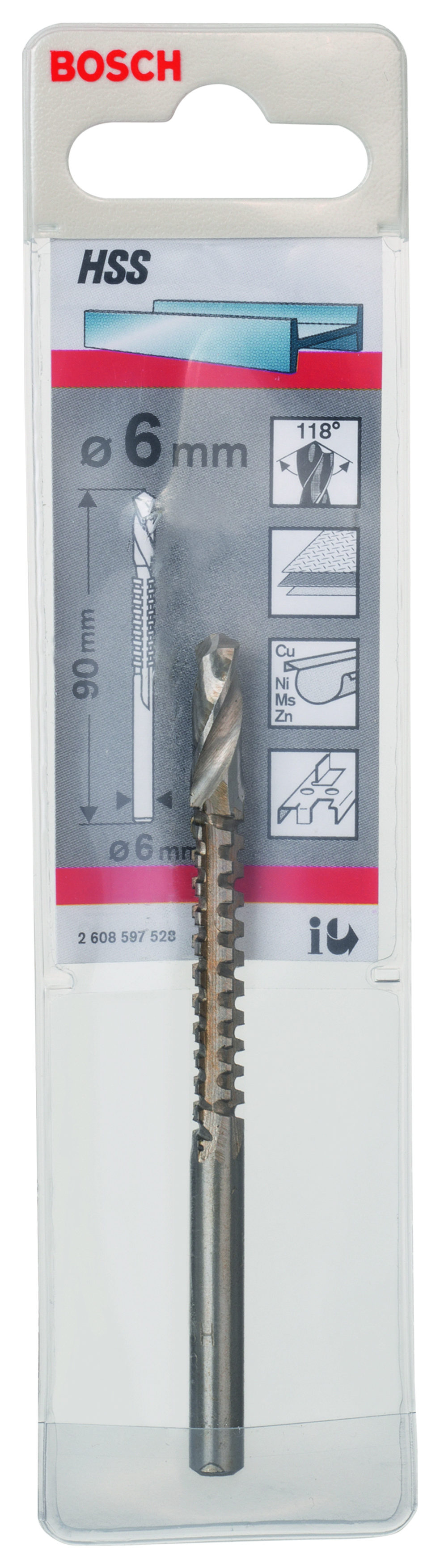 Tekst produktu, osprzęt, szary Wiertło frezowe ze stali szybkotnącej HSS, ostrze szlifowane krzyżowo z kątem wierzchołkowym 118°, głęboko tłoczone zęby tnące Do drewna i metali kolorowych Zalecana prędkość obrotowa: 1000 do 2000 min-1