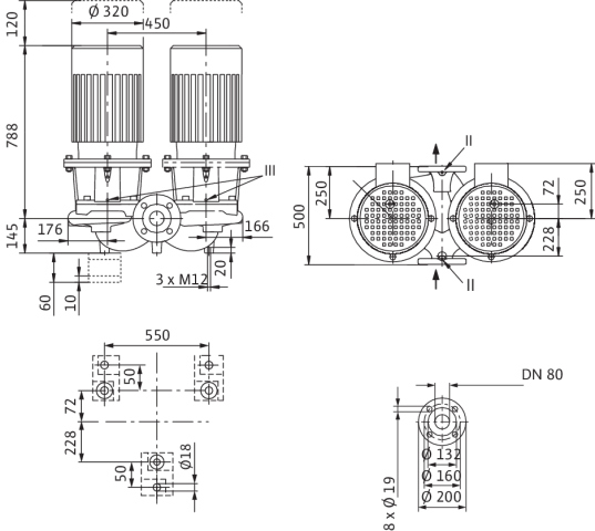 Pompa podwójna Inline z dwiema jednostopniowymi dławnicowymi pompami wirowymi we wspólnym korpusie z klapą przełączającą, do montażu na rurociągu lub do ustawienia na fundamencie. Kołnierz zaślepiający na korpusie i konsole za dopłatą. Odporna na drgania, zapewniająca cichą pracę konstrukcja blokowa z latarnią i sztywno połączonym standardowym silnikiem kołnierzowym (silnik odpowiadający normom). Z niezależnym od kierunku obrotów mieszkowym uszczelnieniem mechanicznym z wymuszonym opływem oraz wirnikiem redukującym kawitację. Kołnierze z przyłączami pomiarowymi ciśnienia R 1/8. Korpus pompy i latarnia z powłoką kataforetyczną. W wersji standardowej silniki w klasie IE3. Pompy z silnikami ≥ 5,5 kW są seryjnie wyposażone w czujniki termistorowe jako zabezpieczenie silnika. Skrzynia zaciskowa do silnika ≤ 7,5 kW może być wykonana z metalu lub tworzywa sztucznego. Jeśli bezwzględnie wymagana jest metalowa skrzynia zaciskowa, należy zamówić odpowiedni wariant specjalny. Skrzynie zaciskowe