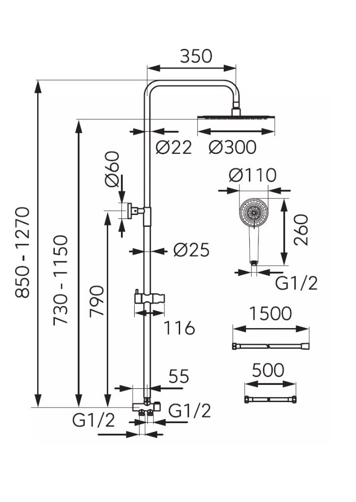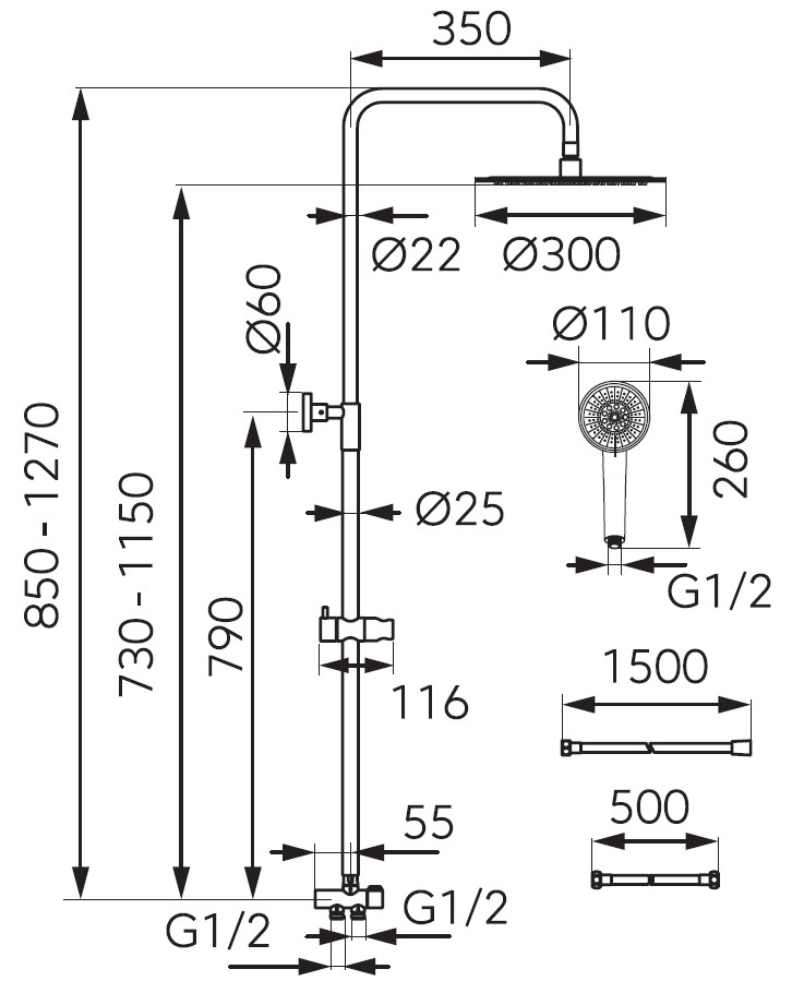 • wąż podłączeniowy 500 mm z nakrętką G1/2 - uniwersalne podłączenie do każdej baterii wannowej i natryskowe
