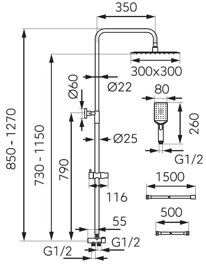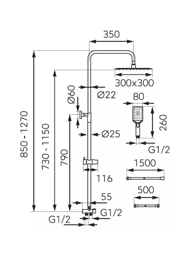 • wąż podłączeniowy 500 mm z nakrętką G1/2 - uniwersalne podłączenie do każdej baterii wannowej i natryskowej