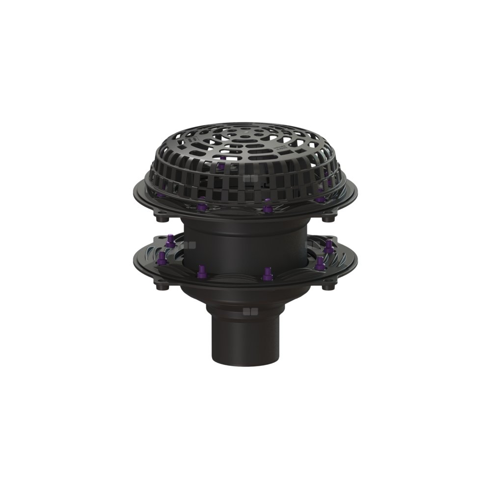 Wpust dachowy Ecoguss służy do odwodnienia punktowego i jest wyposażony w dociskowy kołnierz uszczelniający i osłonę przed żwirem. Przystosowane do recyklingu tworzywo kompozytowe Ecoguss spełnia najwyższe wymagania akustyczne, jest odporne na agresywne czynniki, odporne na temperaturę do 400°C i korozję. Dociskowy kołnierz uszczelniający z bolcami i śrubami ze stali nierdzewnej służy do dociskania lub zgrzewania taśm bitumicznych i polimerowo-bitumicznych oraz taśm uszczelniających z tworzywa sztucznego i elastomerów. Do uszczelnień wodoszczelnych mogą być stosowane tylko sprawdzone przez producenta membrany hydroizolacyjne. Wyrównanie potencjałów nie jest konieczne. Wskazówka: W przypadku dachu trapezowego o powierzchni przekraczającej 2500 metrów kwadratowych należy skonsultować się z centrum serwisowym firmy KESSEL.
