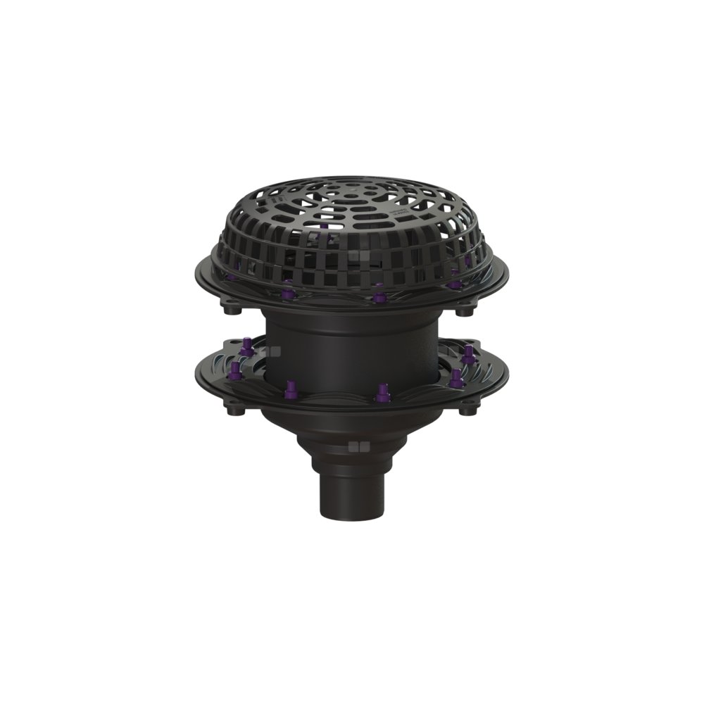 Wpust dachowy Ecoguss służy do odwodnienia punktowego i jest wyposażony w dociskowy kołnierz uszczelniający i osłonę przed żwirem. Przystosowane do recyklingu tworzywo kompozytowe Ecoguss spełnia najwyższe wymagania akustyczne, jest odporne na agresywne czynniki, odporne na temperaturę do 400°C i korozję. Dociskowy kołnierz uszczelniający z bolcami i śrubami ze stali nierdzewnej służy do dociskania lub zgrzewania taśm bitumicznych i polimerowo-bitumicznych oraz taśm uszczelniających z tworzywa sztucznego i elastomerów. Do uszczelnień wodoszczelnych mogą być stosowane tylko sprawdzone przez producenta membrany hydroizolacyjne. Wyrównanie potencjałów nie jest konieczne. Wskazówka: W przypadku dachu trapezowego o powierzchni przekraczającej 2500 metrów kwadratowych należy skonsultować się z centrum serwisowym firmy KESSEL.