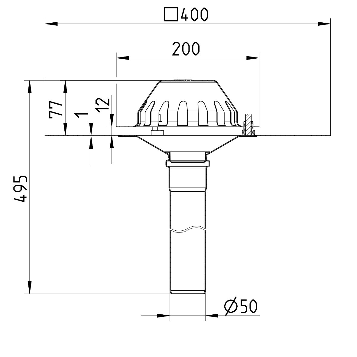 Wpust dachowy grawitacyjny DN =50 mm z kołnierzem nierdzewnym do papy bitumicznej