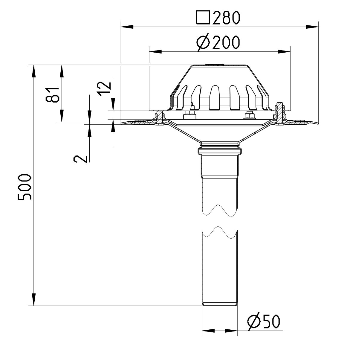 Wpust dachowy grawitacyjny DN =50mm z kołnierzem i przeciwkołnierzem do pojedynczej warstwy izolacyjnej, długość wpustu 501 mm