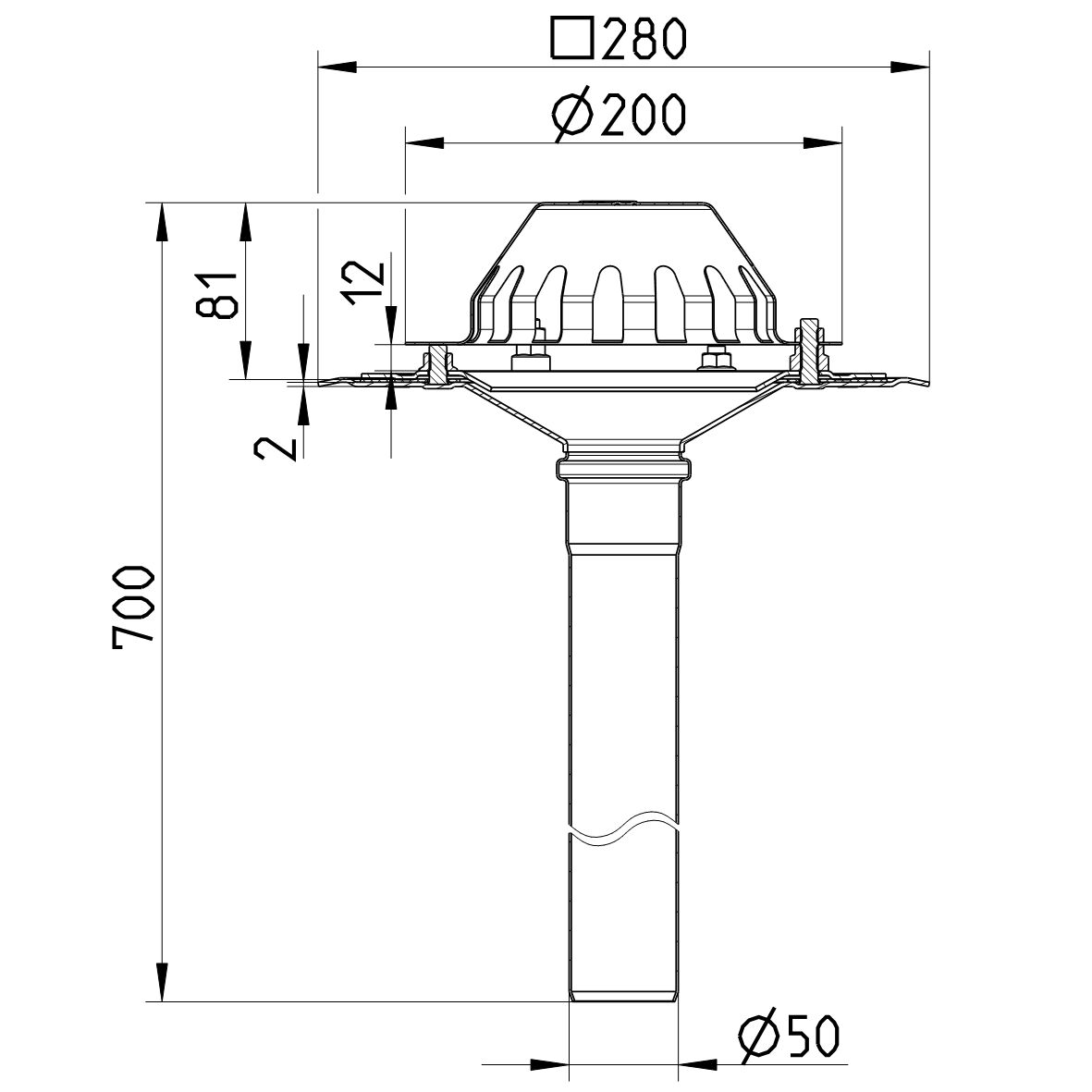 Wpust dachowy grawitacyjny DN =50mm z kołnierzem i przeciwkołnierzem do pojedynczej warstwy izolacyjnej, długość wpustu 701 mm