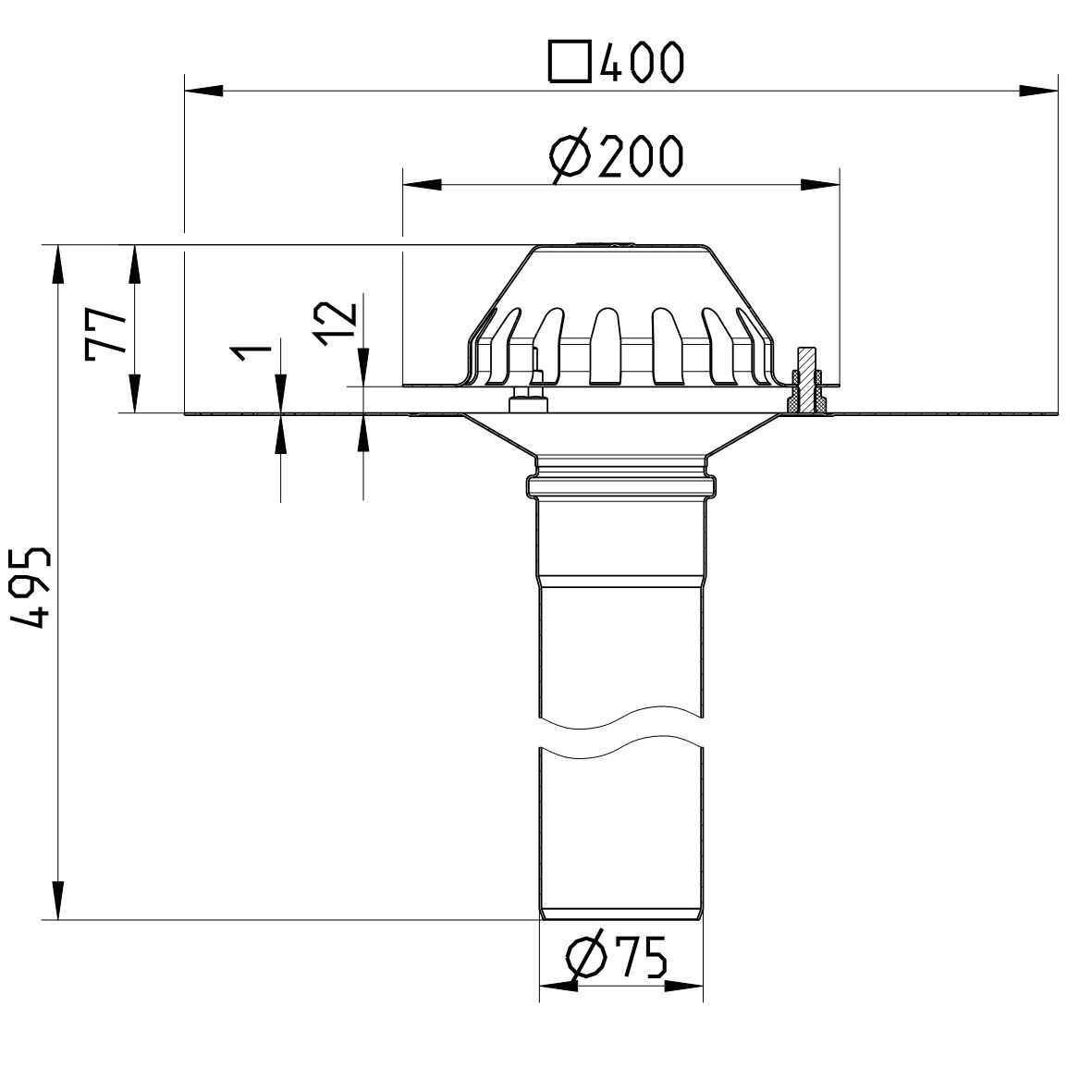 Wpust dachowy grawitacyjny DN =75 mm z kołnierzem nierdzewnym do papy bitumicznej