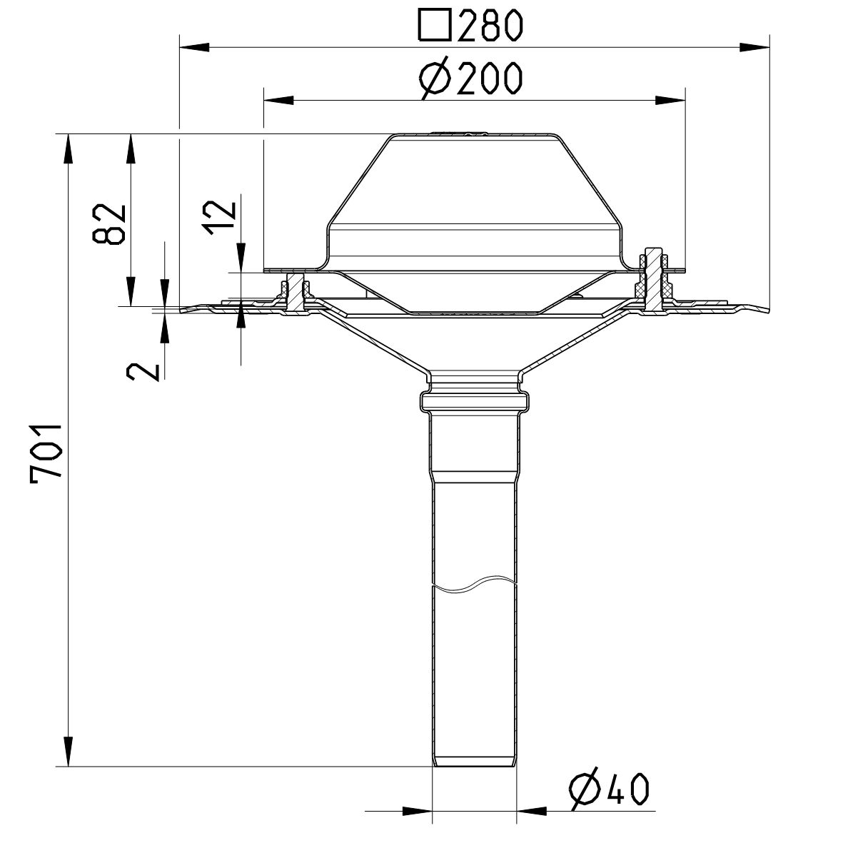 Wpust dachowy podciśnieniowy DN =40 mm z kołnierzem nierdzewnym do pojedynczej warstwy izolacyjnej, długość wpustu 702 mm