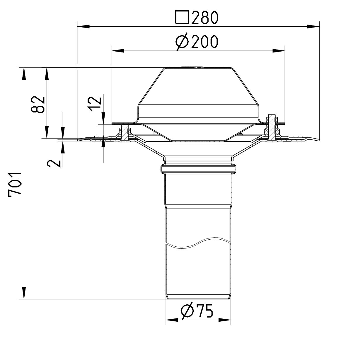 Wpust dachowy podciśnieniowy DN =75 mm z kołnierzem nierdzewnym do pojedynczej warstwy izolacyjnej, długość wpustu 702 mm