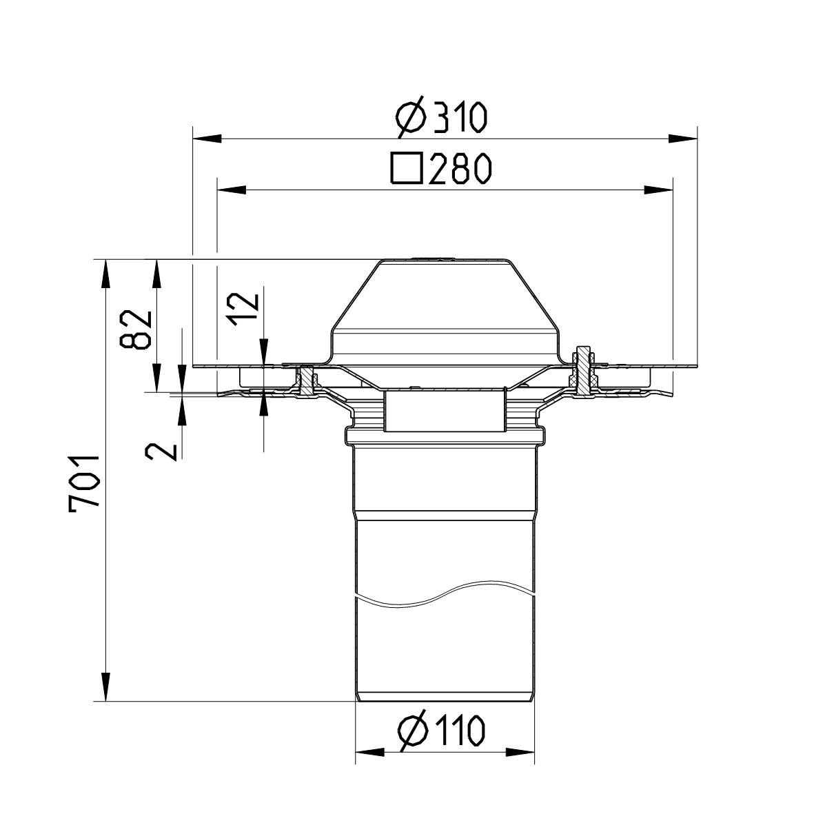 Wpust dachowy podciśnieniowy fi110 mm z kołnierzem nierdzewnym do pojedynczej warstwy izolacyjnej, długość wpustu 702 mm
